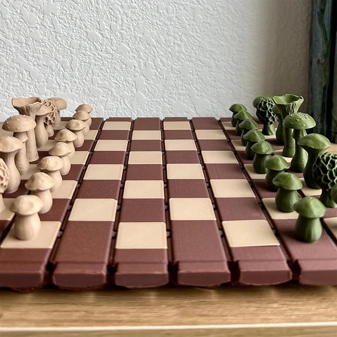 Forest Chess Set: What's more enjoyable than playing a game of nature-themed chess with friends while camping or traveling in the great outdoors?This innovative chess set features a log that unrolls into a beautiful wood-colored chessboard, vealing an enchanting world of mushroom chess pieces.
