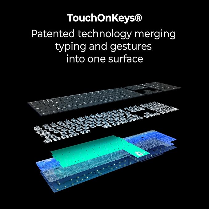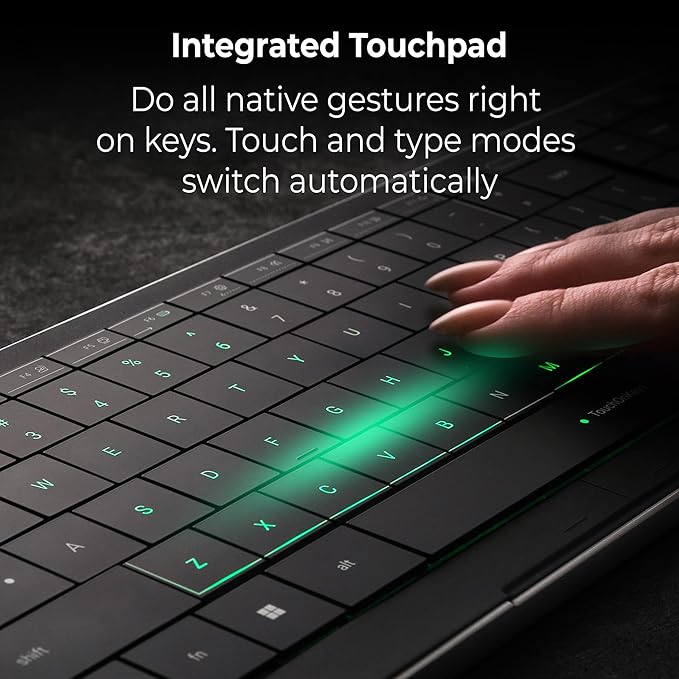 🎨💡 CUSTOM CONTROL WITH TOUCHONKEYS APP. Personalize gestures, adjust Touch Sliders, set per-key RGB effects, and create app-specific profiles. Train adaptive AI for your typing style — unique among wireless keyboards with touchpad options.