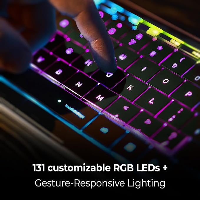 🎨💡 نور پسزمینه RGB قابل تنظیم. 131 LED RGB برای هر کلید با نور اتاق شما سازگار میشوند و به حرکات واکنش نشان میدهند. 🎨💡 کنترل سفارشی با برنامه TOUCHONKEYS. حرکات را شخصیسازی کنید، اسلایدرهای لمسی را تنظیم کنید، جلوههای RGB را برای هر کلید تنظیم کنید و پروفایلهای مخصوص برنامه ایجاد کنید. هوش مصنوعی تطبیقی را برای سبک تایپ خود آموزش دهید - منحصر به فرد در بین صفحه کلیدهای بیسیم با گزینههای تاچپد.