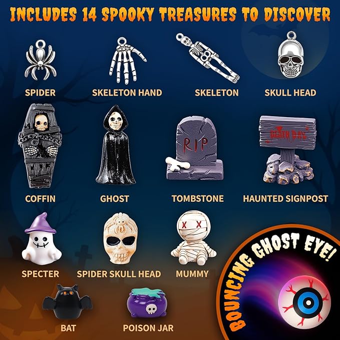 DIG UP 14 SPOOKY TREASURES – Break open the pumpkin brick to uncover 4 wearable metal charms (skull, skeleton, skeleton hand, spider) plus 9 creepy mini toys like mummy, coffin & haunted signpost. Bonus bouncy ghost eyeball included—perfect for Halloween treasure hunts, trick-or-treat handouts & party favors