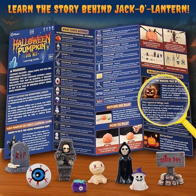 LEARN JACK-O’-LANTERN LEGENDS – Full-color booklet included! Discover Halloween folklore, pumpkin history & fun facts while classifying treasures. Turns a simple dig into a storytelling adventure and a Halloween educational activity